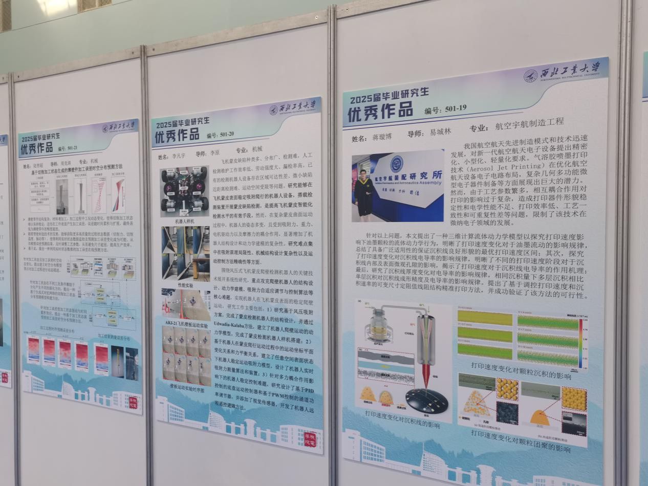 在众多优秀的毕业成果中,航空宇航制造工程专业毕业生李硕凡的作品格外引人关注。他针对钛合金镀铬层的微动磨损肌理分析的问题,开展了“实验测试—理论分析—数值模拟”完整研究体系,为表面涂覆处理等工艺提高抗微动磨损的研究提供理论支撑和应用依据。他热情的讲述吸引了各专业学生的目光,引来众多学生驻足观看、学习与探讨。前来交流学习的学生纷纷表示,师兄师姐们的作品将理论知识与实践经验相结合,为智能制造、航空航天等领域探索了更多创新的可能性。