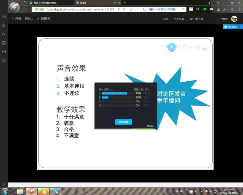 杜随更教授根据线上教学需要,提前将和学生互动的题目做到了课件里面。授课时随时注意讨论区学生反应,并通过提问等方式,尽量创造机会和学生互动;同时充分利用教学平台相关功能,对学生课堂效果进行实时统计,实现了课堂教学做不到的环节。