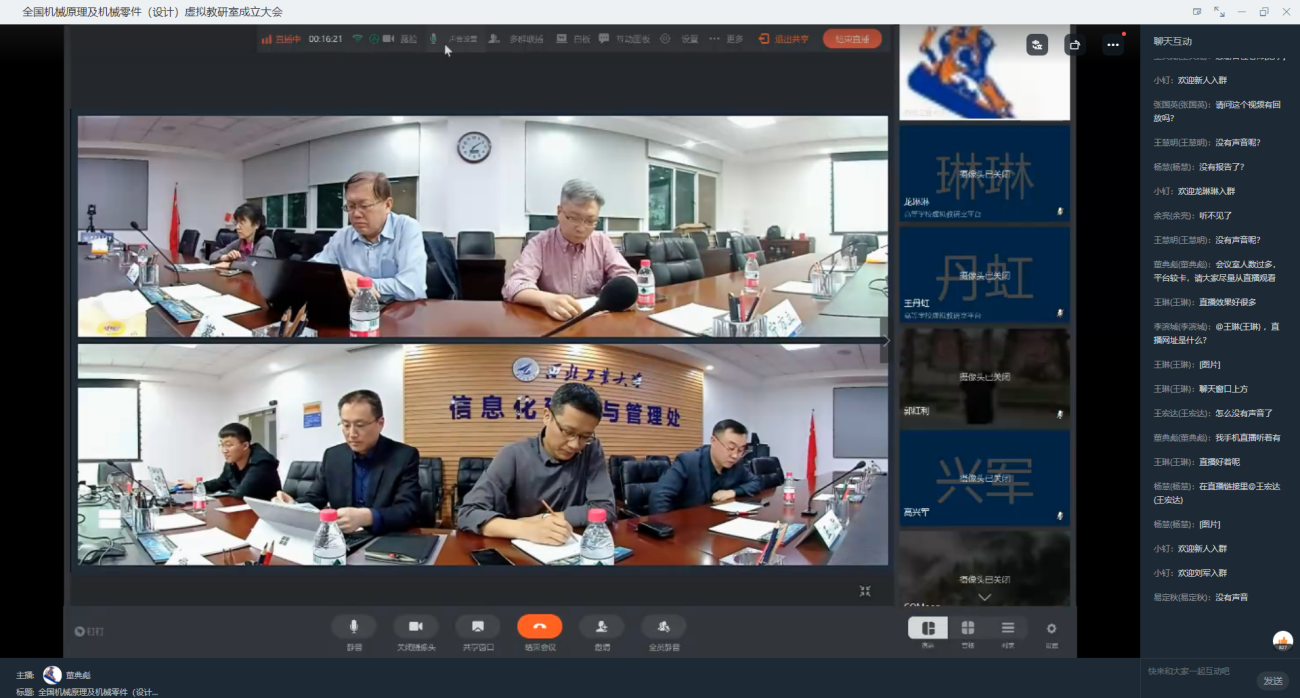 院长常洪龙、副院长常智勇以及参与申报机械原理及机械零件(设计)课程虚拟教研室的西安交通大学、上海交通大学、西安电子科技大学、西北农林科技大学、北京理工大学、中国矿业大学、山东大学、电子科技大学、西南交通大学、郑州大学、宁夏大学、兰州理工大学12所高校的课程负责人、出版社及相关企业负责人、本虚拟教研室成员近300人线上线下参加会议。会议由JavBus