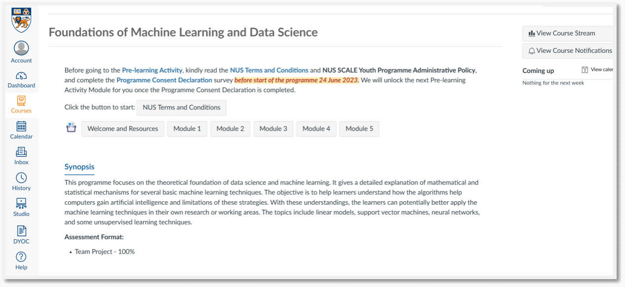 NUS will set up individual accounts for participants on the NUS online learning platform, Canvas. Each student will use their Canvas account to receive school notifications, access study tasks assigned by lecturers, submit assignments, and download course materials.