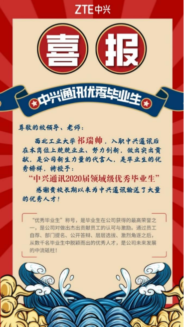 2020届硕士祁瑞帅在工作中业绩突出,被评为“中兴通信2020届领域级优秀毕业生”。