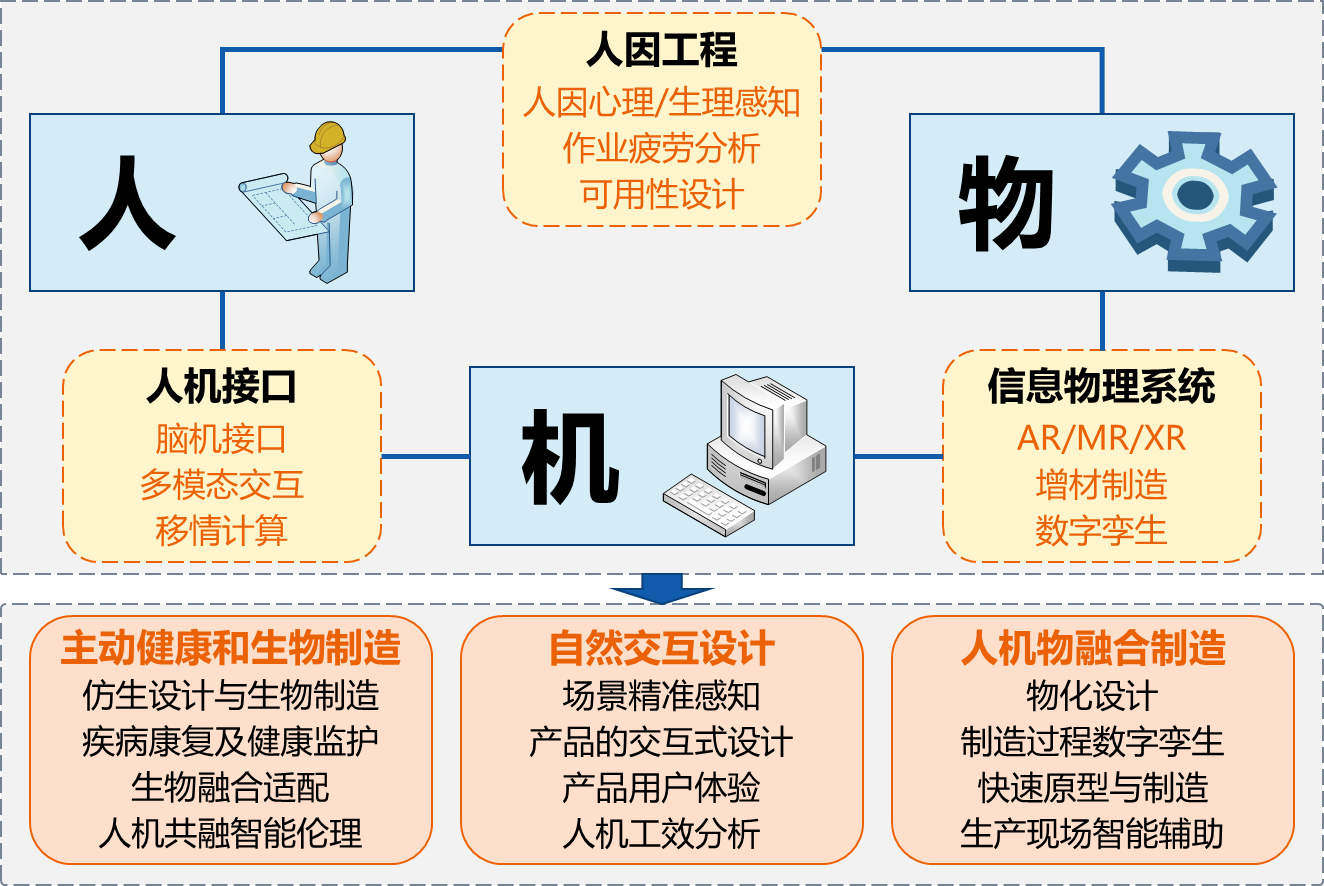 优势学科交叉融合,围绕人机共融智能这一前沿理论,面向国家在人工智能、航空航天、智能制造、主动健康、生物医疗等领域的重大战略和航空航天等重大产品的应用需求,解决智能制造过程最后一公里的问题。重点开展主动健康和生物制造、自然交互设计、人机物融合制造3个方向的研究。