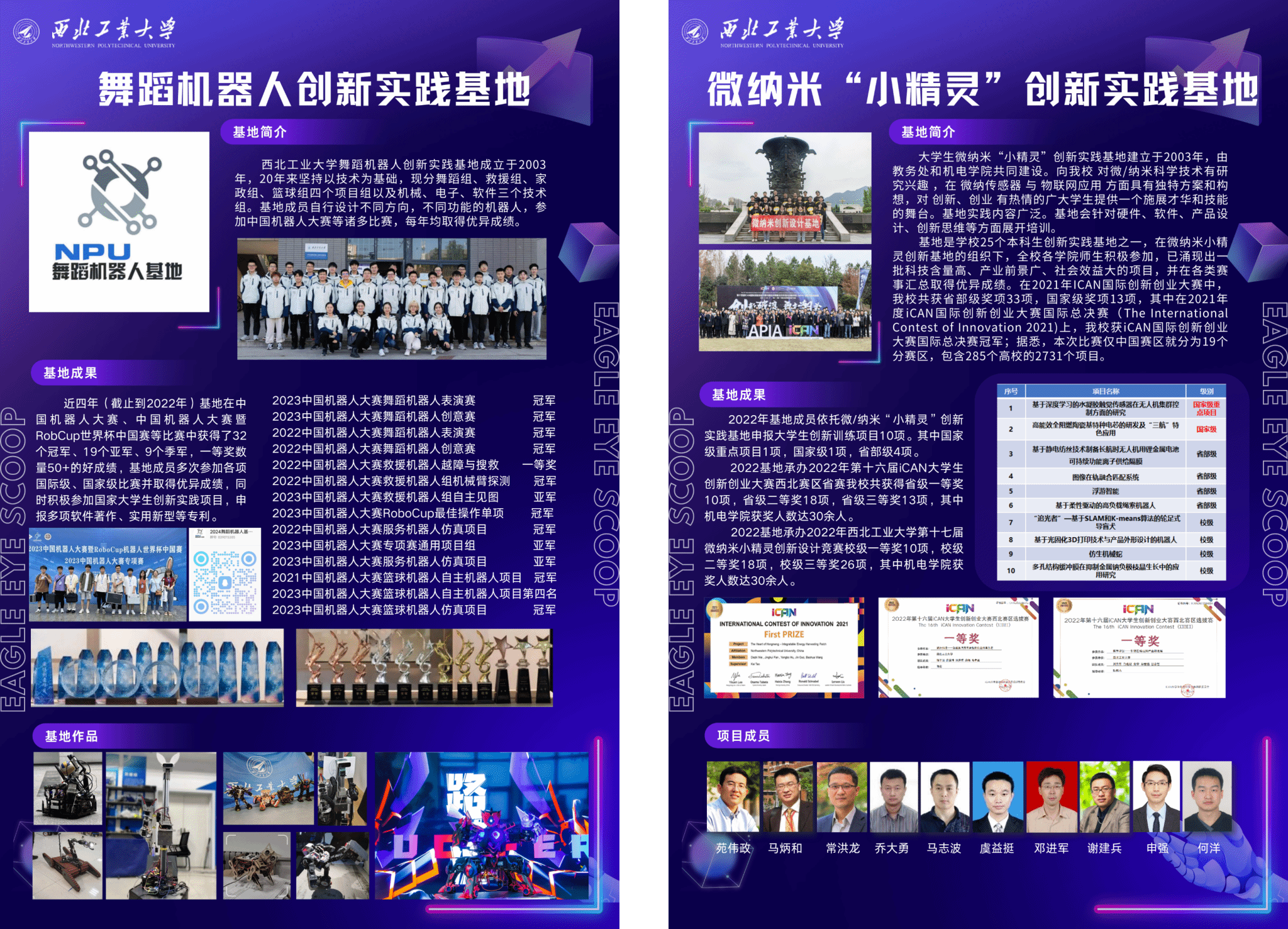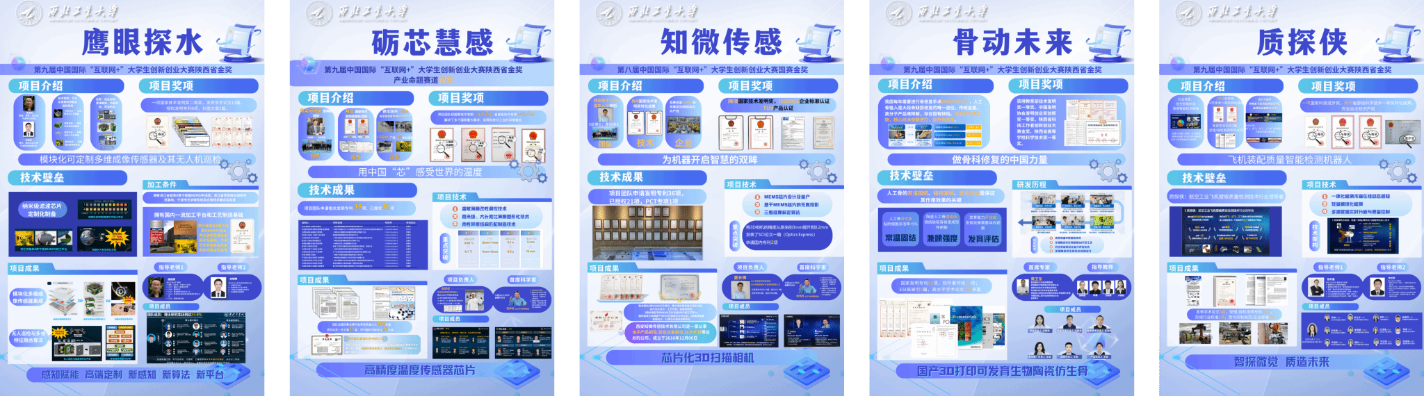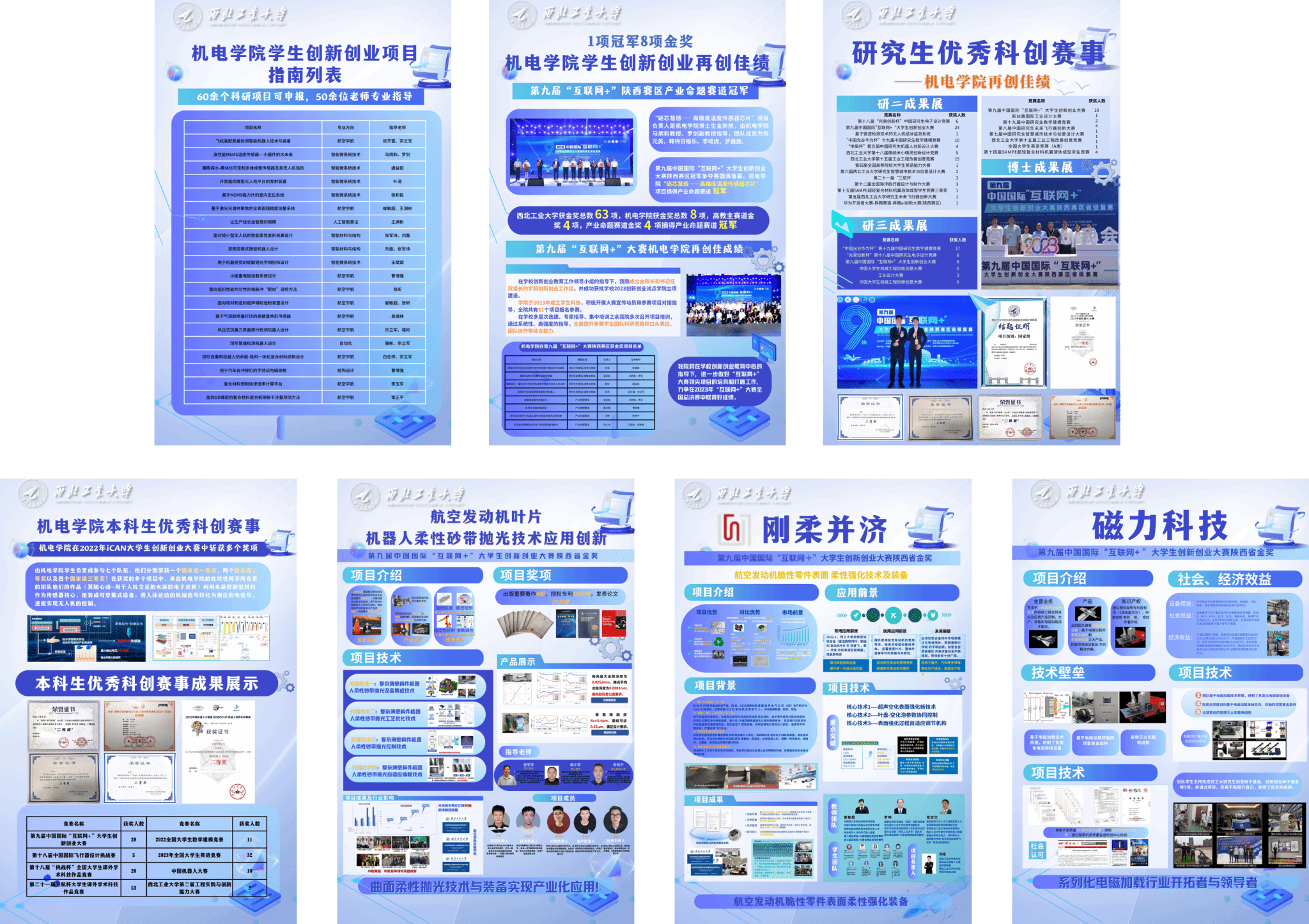 科创成果系列展览,包含第九届“互联网+”陕西省金奖项目、第八届“互联网+”国赛金奖项目、科创赛事介绍、科创基地介绍(舞蹈机器人基地、微纳米小精灵基地)等。