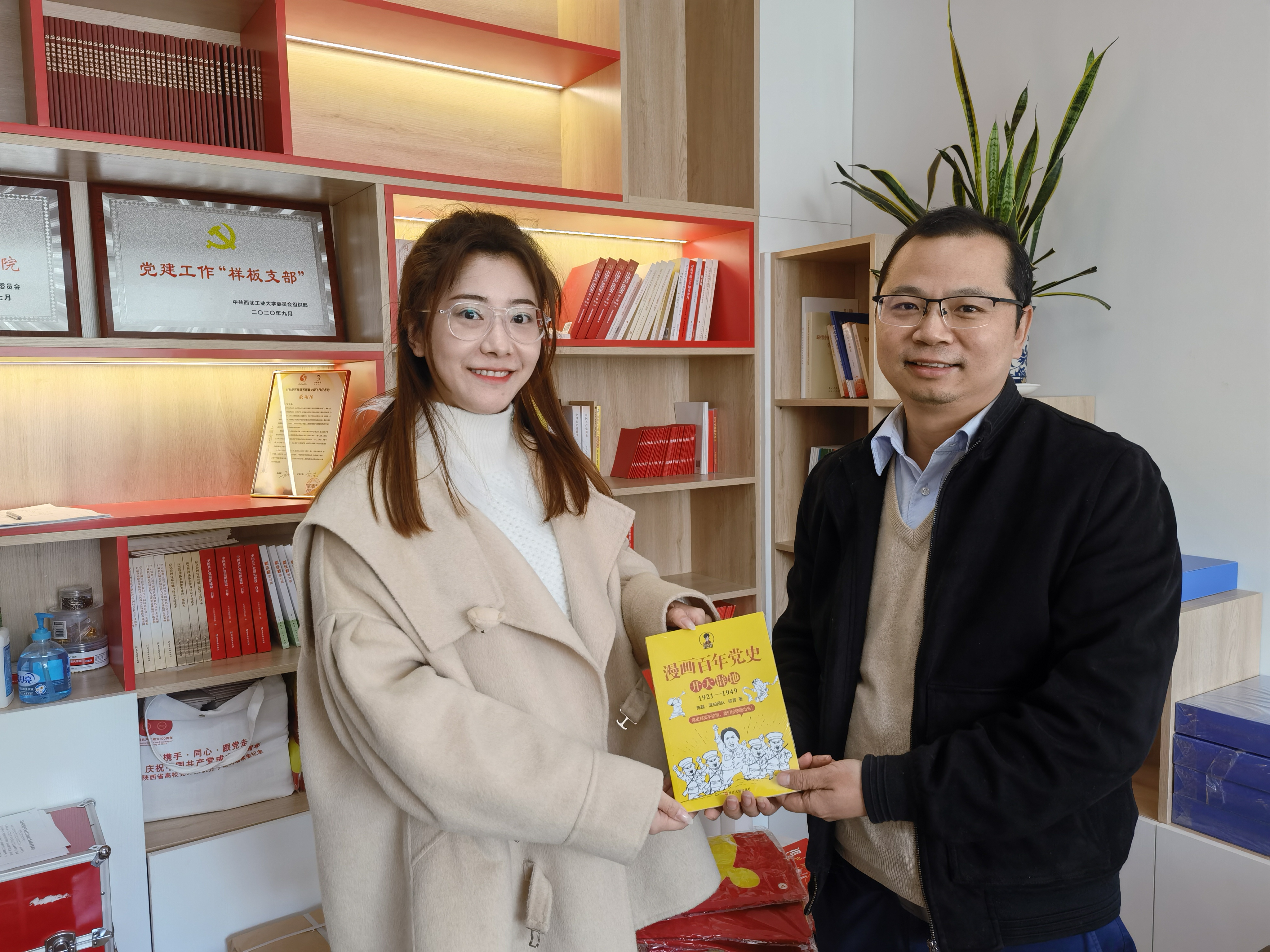 师生发放由工业设计系毕业生陈磊编著的《漫画百年党史》党史学习书籍,并受到师生广泛好评。