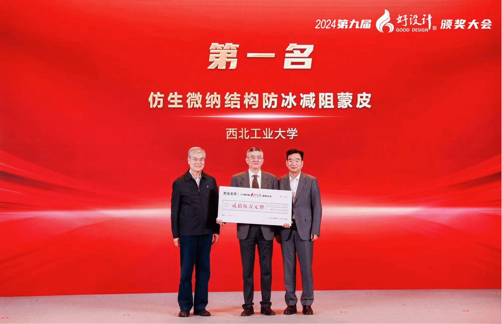 苑伟政、何洋教授团队申报的“仿生微纳结构防冰减阻蒙皮”项目荣膺2024年中国“好设计”金奖第一名。
