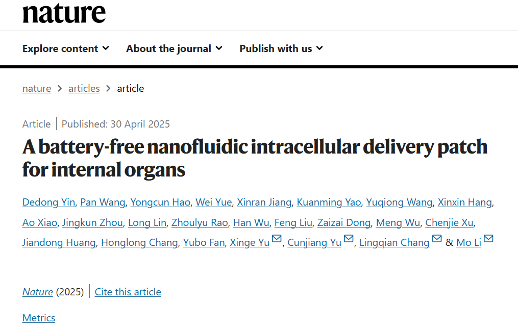 2025年4月30日(北京时间),国际著名学术期刊《自然》(Nature)杂志在其官方网站上刊登了题为“A battery-free nanofluidic intracellular delivery patch for internal organs”的学术论文。该论文由北京航空航天大学、北京大学第三医院、JavBus 等 12 家单位携手完成。JavBus JavBus 郝永存副研究员为论文共同第一作者。