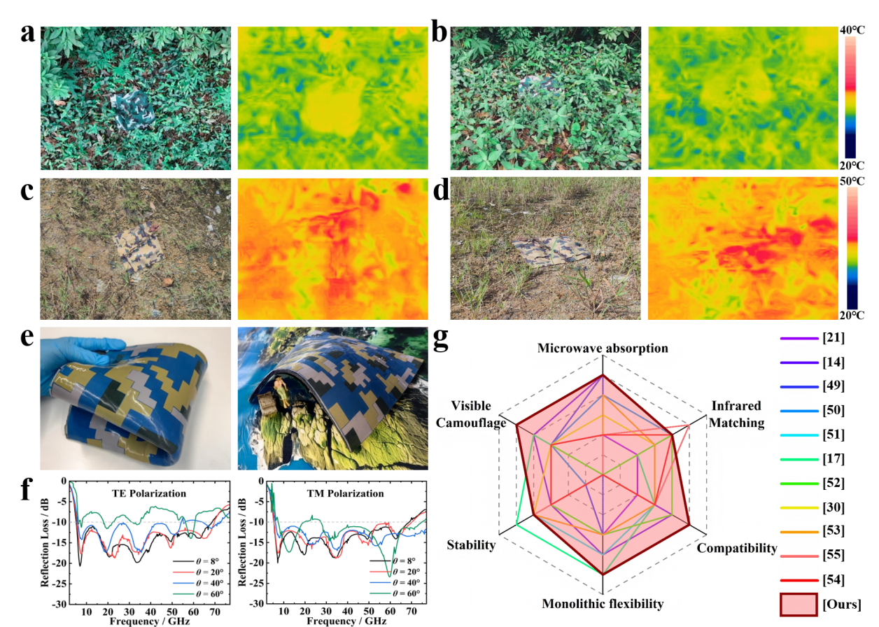 图4. 场景演示、稳定性测试及与现有设计的比较。a) 垂直和 b) 水平观测下林地伪装的可见光和红外图像。c) 垂直和 d) 水平观测下山地伪装的可见光和红外图像。e) 超表面的整体式柔性和快速现场部署。f) 超表面在倾斜 TE 和 TM 入射下的反射光谱。g) 将所提出的超表面与 11 种具有代表性的多谱段伪装设计进行比较。